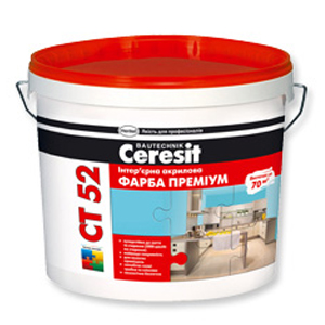 Ceresit СТ 52 (Церезит СТ 52) - акриловая суперстойкая краска к истиранию и мытью (5000 циклов на истирание), полуматовая, превосходная укрывистость, паропроницаемая. Идеально подходит для для влажных помещений и предотвращает появление грибка и плесени. Расход: 0,15-0,2 л/кв.м. при однослойном нанесении и около 0,3 л/кв.м. при двухслойном нанесении.